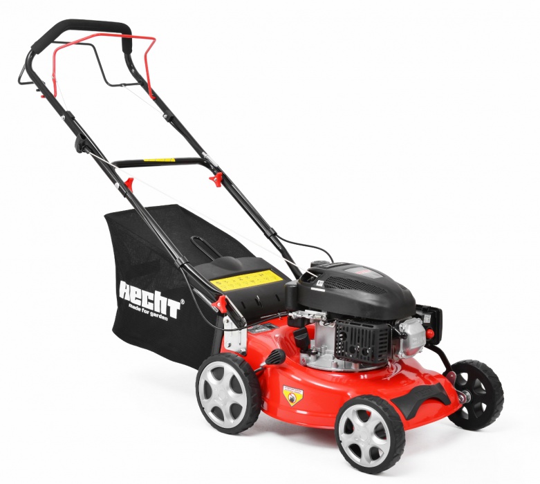 Benzínová sekačka s pojezdem. Motor Hecht OHV, výkon 3,5 HP, záběr 40,6 cm, koš 40 l. Hmotnost 27 kg.